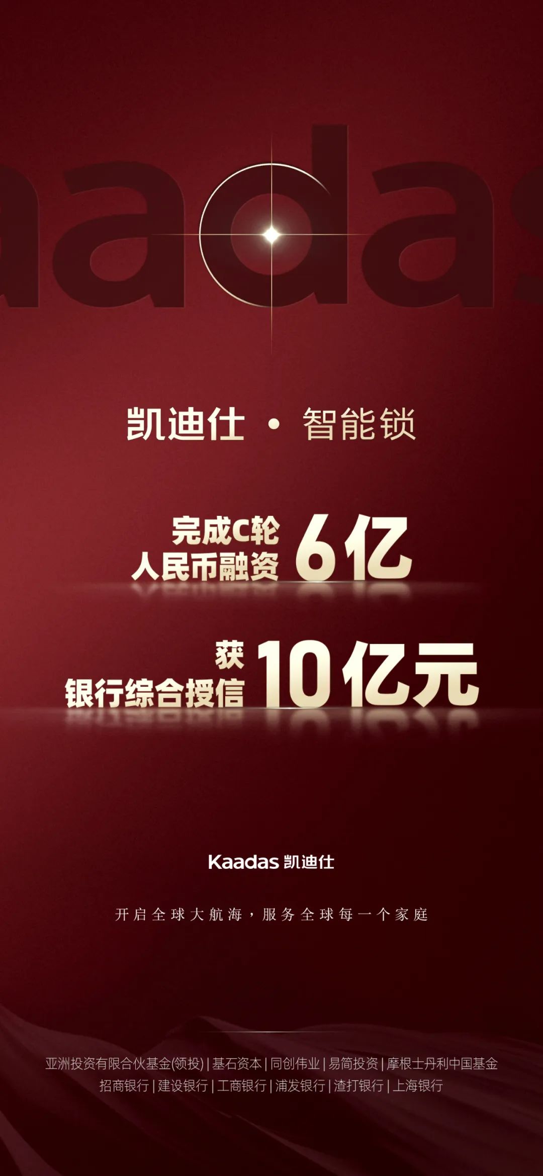 近日,Kaadas凱迪仕正式完成C輪融資,單輪融資金額達(dá)6億人民幣。本輪由亞洲投資有限合伙基金(以下簡(jiǎn)稱“亞投基金”)領(lǐng)投,基石資本、同創(chuàng)偉業(yè)、易簡(jiǎn)投資、摩根士丹利(中國(guó))股權(quán)投資管理有限公司管理的人民幣私募股權(quán)投資基金(以下簡(jiǎn)稱“摩根基金”)跟投。此外,品牌另獲招商銀行、建設(shè)銀行、工商銀行、浦發(fā)銀行,渣打銀行、上海銀行六大銀行共計(jì)10億元綜合授信。