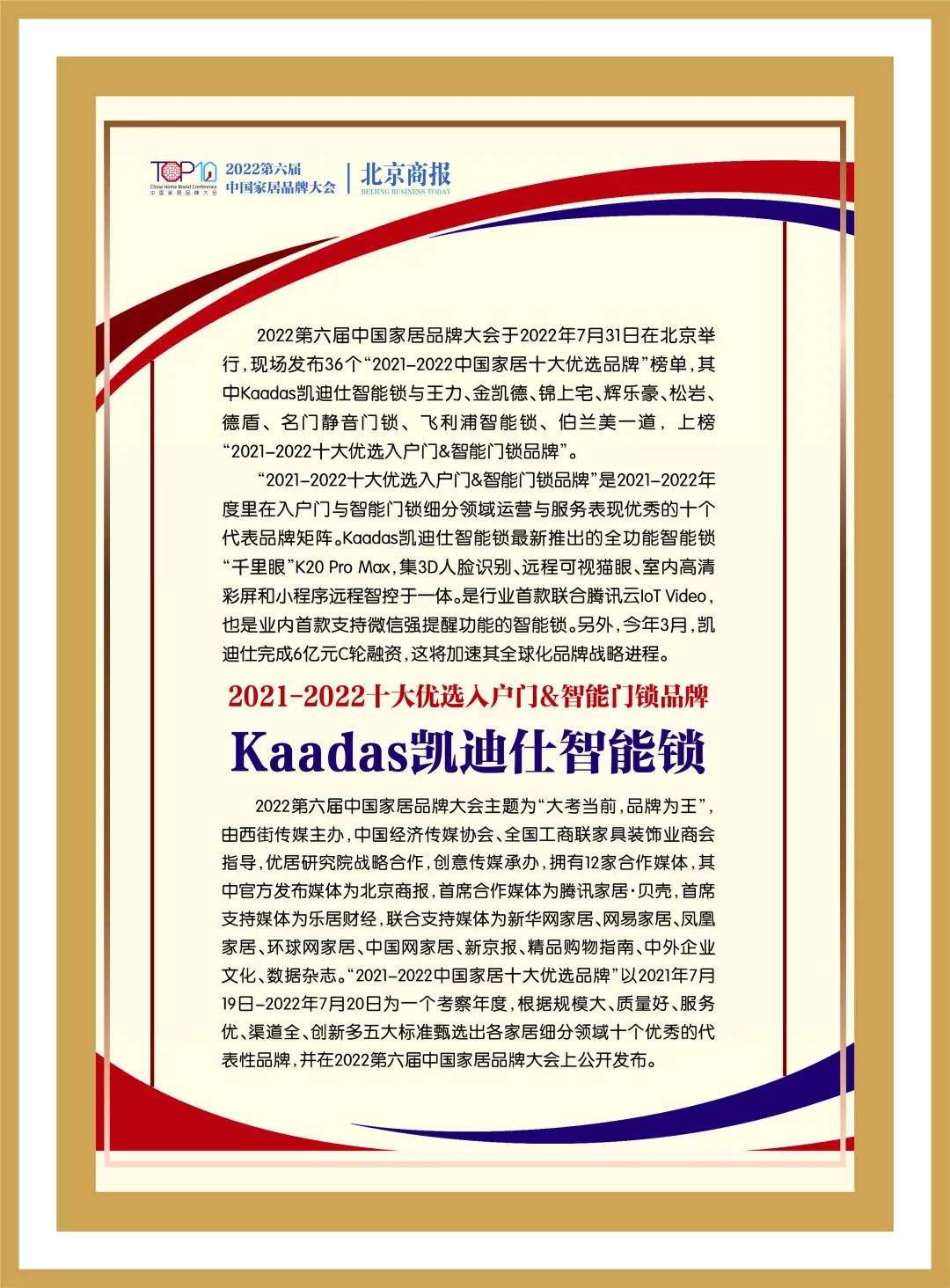 2022第六屆中國家居品牌大會于北京舉行,現(xiàn)場發(fā)布36個“2021-2022中國家居十大優(yōu)選品牌”榜單,Kaadas凱迪仕憑借高品質(zhì)產(chǎn)品和優(yōu)質(zhì)服務(wù),上榜“2021-2022十大優(yōu)選入戶門&智能門鎖品牌”,這也是凱迪仕第三次上榜。