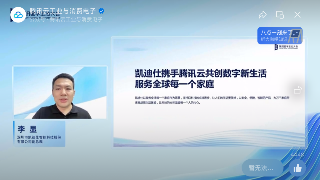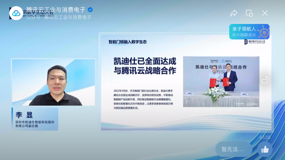 11月30日-12月1日,有著產(chǎn)業(yè)互聯(lián)網(wǎng)年度盛會美譽的“2022騰訊全球數(shù)字生態(tài)大會”在深圳寶安召開。Kaadas凱迪仕作為騰訊云戰(zhàn)略合作伙伴受邀亮相本次盛會,并就凱迪仕智能鎖在數(shù)字場景的創(chuàng)新應(yīng)用進(jìn)行了分享交流。