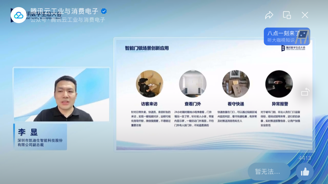 李總在分享中介紹了智能鎖IoT演進(jìn)歷程,就今年凱迪仕與騰訊云達(dá)成的全面戰(zhàn)略合作展開了深入說明,并詳細(xì)介紹了業(yè)內(nèi)首款搭載騰訊云IoT Video智能鎖——凱迪仕“千里眼”智能鎖K20 Pro Max。李總更表示“凱迪仕已張開雙臂全面擁抱萬物互聯(lián)時代,引領(lǐng)智能鎖行業(yè)IoT 演進(jìn)。”