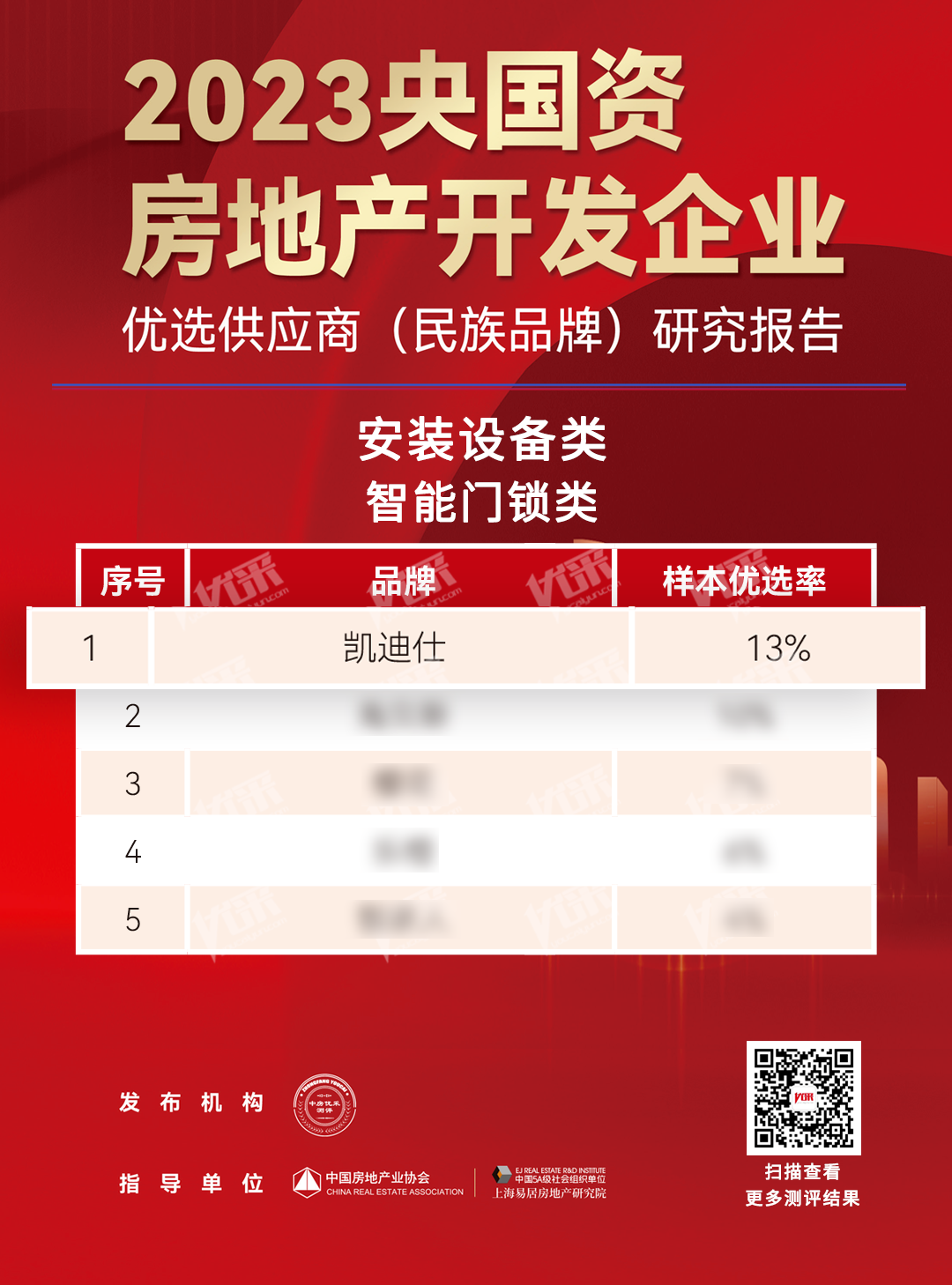 凱迪仕通過層層審核,多維度展現(xiàn)了頭部品牌的實力,以13%的樣本優(yōu)選率,在安裝設(shè)備類智能門鎖類排名第一。