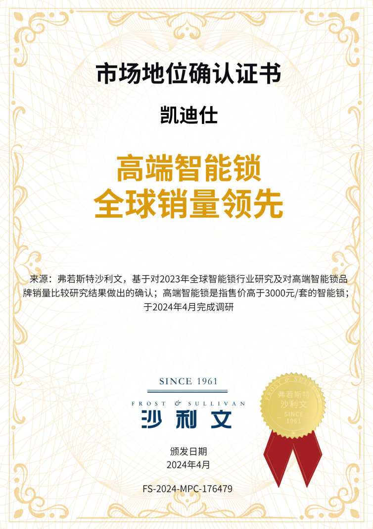 作為全球領(lǐng)先的高端智能鎖品牌,凱迪仕一直都是專業(yè)、高端、安全、智能的代表。目前,凱迪仕產(chǎn)品已暢銷36國(guó),累計(jì)熱銷超1000萬(wàn)臺(tái),并獲得711項(xiàng)專利,智能鎖專利數(shù)量位列全球第一。今年5月,凱迪仕通過(guò)了國(guó)際知名全球調(diào)研機(jī)構(gòu)、全球知名企業(yè)增長(zhǎng)咨詢公司弗若斯特沙利文頒發(fā)的6項(xiàng)認(rèn)證,在專利數(shù)量、全球銷量、銷售額等多個(gè)維度得到了權(quán)威認(rèn)可。