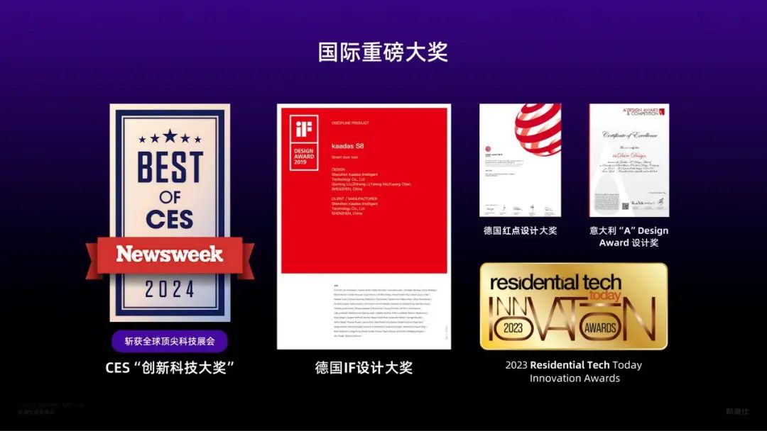 凱迪仕集團(tuán)還參展了世界最大、影響力廣泛的全球頂尖科技展會(huì)——CES國(guó)際消費(fèi)類電子產(chǎn)品展覽會(huì),斬獲Best of CES 2024獎(jiǎng)項(xiàng)。此前,凱迪仕還獲得了德國(guó)iF設(shè)計(jì)大獎(jiǎng)、德國(guó)紅點(diǎn)設(shè)計(jì)大獎(jiǎng)、意大利“A”Design Award設(shè)計(jì)獎(jiǎng)、2023 Residential Tech Today Innovation Awards等海外大獎(jiǎng)。