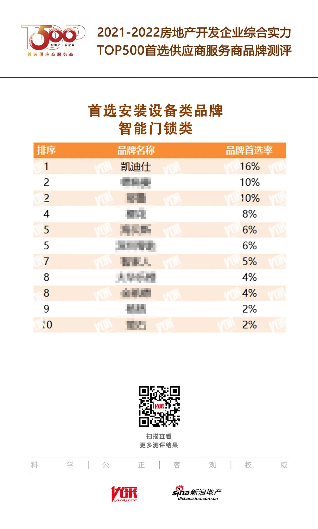 本次活動共有上千家供應(yīng)商參與角逐,凱迪仕實力與口碑并存,在四個層面的測評中均表現(xiàn)優(yōu)異,以16%的品牌首選率,再次位列智能門鎖行業(yè)榜首,品牌勢能強勢爆發(fā)。