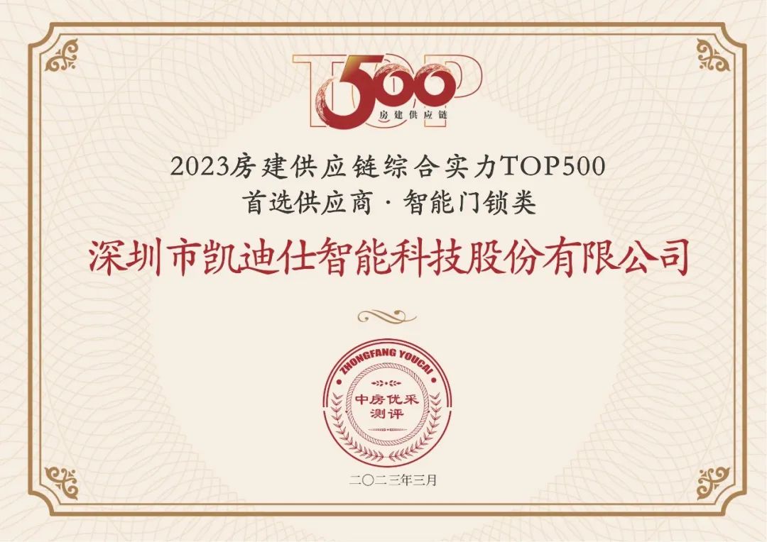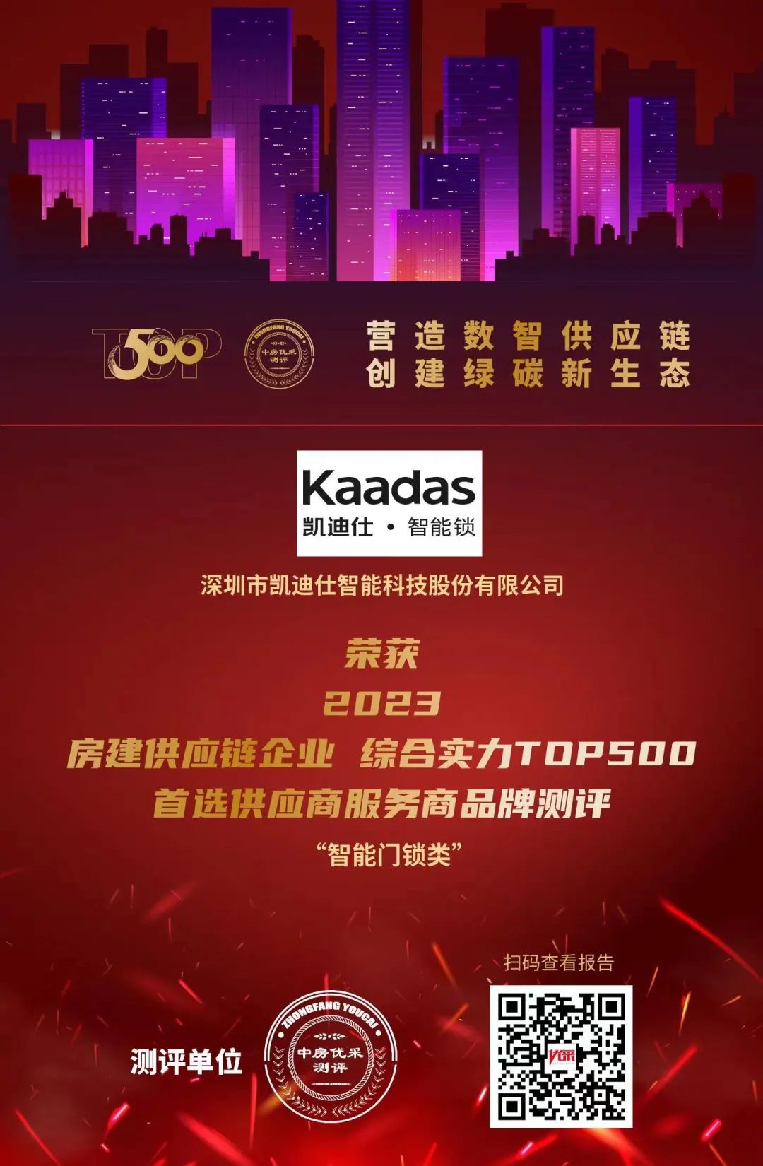 今日,2023中國房地產(chǎn)TOP500測評成果發(fā)布會暨房地產(chǎn)企業(yè)發(fā)展高峰論壇在北京隆重舉行。Kaadas凱迪仕以行業(yè)榜首之姿,強(qiáng)勢入選“2023房建供應(yīng)鏈綜合實(shí)力TOP500首選供應(yīng)商·智能門鎖類”并被收錄入2023年中國房地產(chǎn)業(yè)協(xié)會5A供應(yīng)商企業(yè)庫。自2017年該測評新增智能門鎖測評類目至今,凱迪仕已連續(xù)7年入選。
