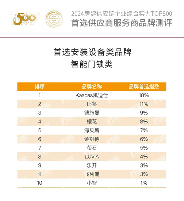 凱迪仕以18%的品牌首選指數(shù)穩(wěn)居智能門鎖行業(yè)第一名,遠(yuǎn)超第二名,同時(shí),凱迪仕被收錄入2024年中國(guó)房地產(chǎn)業(yè)協(xié)會(huì)供應(yīng)鏈大數(shù)據(jù)中心5A供應(yīng)商企業(yè)庫(kù)(5A,即生產(chǎn)力、產(chǎn)品力、服務(wù)力、交付力、創(chuàng)新力)。