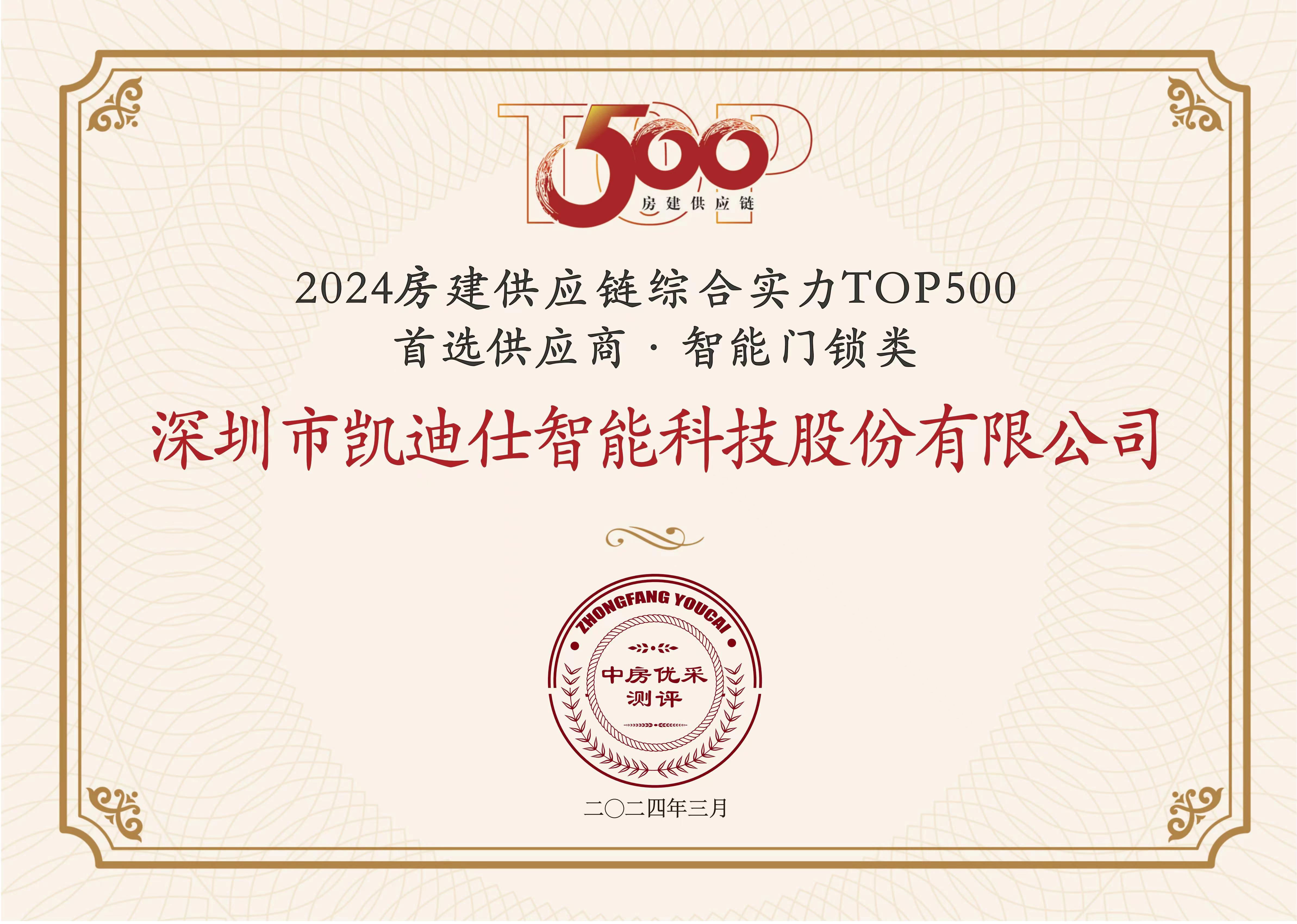 近期,以“新模式 新發(fā)展”為主題的「2024中國(guó)房地產(chǎn)TOP500測(cè)評(píng)成果發(fā)布會(huì)暨房地產(chǎn)企業(yè)發(fā)展高峰論壇」在北京隆重舉辦,凱迪仕連續(xù)8年獲“2024房建供應(yīng)鏈綜合實(shí)力TOP500首選供應(yīng)商·智能門鎖類”殊榮。