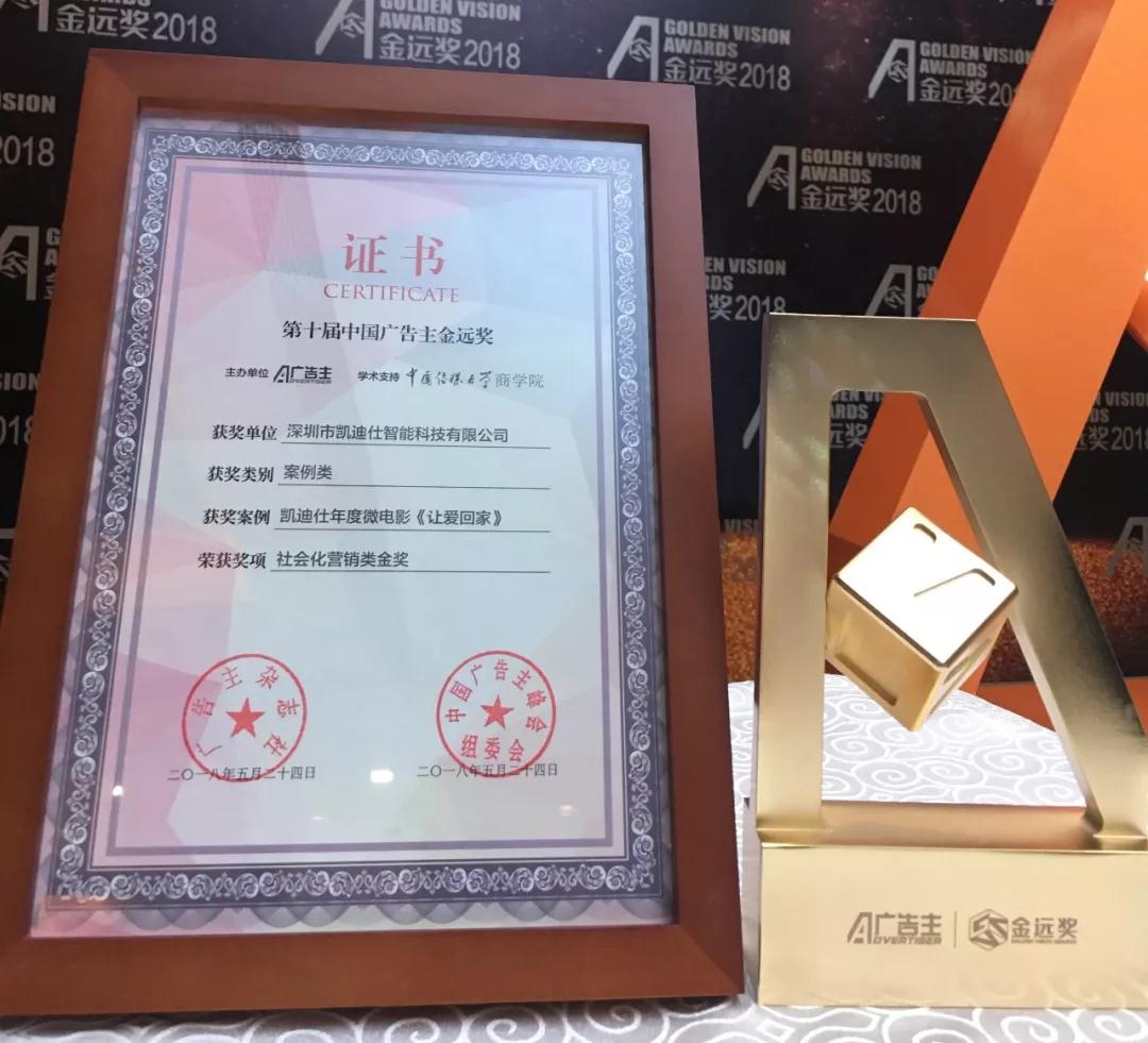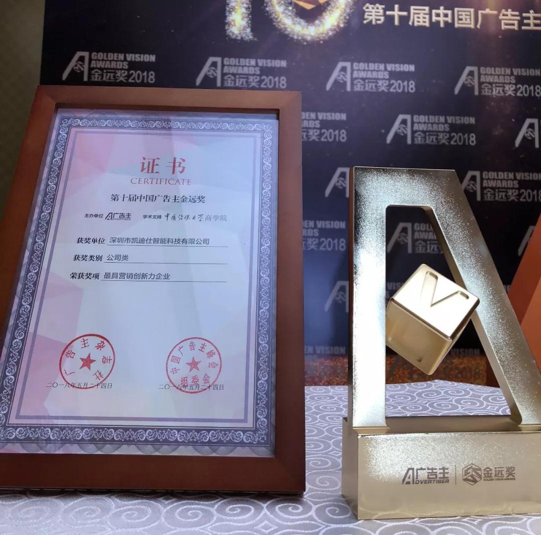 2018年5月24日,“智贏2018”中國(guó)廣告主峰會(huì)暨第十屆金遠(yuǎn)獎(jiǎng)?lì)C獎(jiǎng)盛典在京舉行。Kaadas凱迪仕一舉拿下“最具營(yíng)銷創(chuàng)新力企業(yè)”及“社會(huì)化營(yíng)銷類金獎(jiǎng)”兩大獎(jiǎng)項(xiàng)!