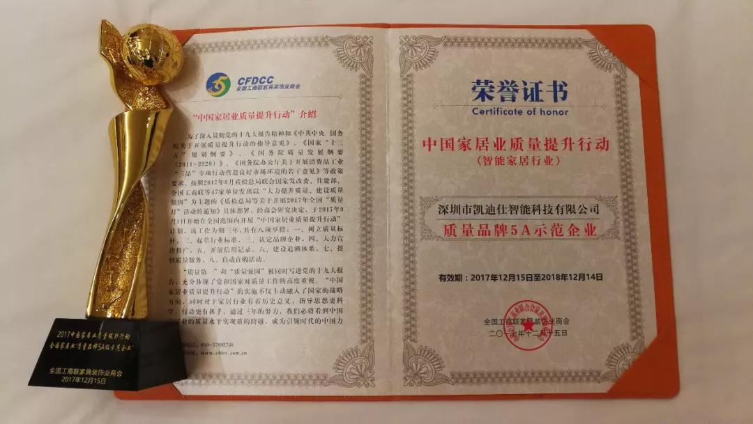 凱迪仕榮獲“全國家居業(yè)質(zhì)量品牌5A示范企業(yè)”,此前,凱迪仕連續(xù)已多年獲得中國質(zhì)量檢驗協(xié)會認(rèn)證,此次又獲全國家居業(yè)肯定,是凱迪仕產(chǎn)品最大的榮耀。