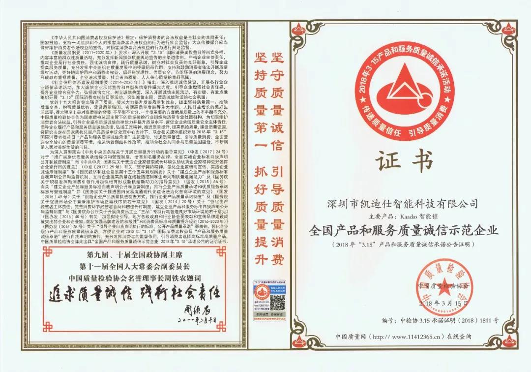2018年3月15日,凱迪仕再獲由中國(guó)質(zhì)量檢驗(yàn)協(xié)會(huì)頒發(fā)的“全國(guó)智能鎖行業(yè)質(zhì)量領(lǐng)先品牌”和“全國(guó)產(chǎn)品和服務(wù)質(zhì)量誠(chéng)信示范企業(yè)”兩項(xiàng)大獎(jiǎng)。至此,凱迪仕已連續(xù)四年獲得這兩項(xiàng)殊榮。