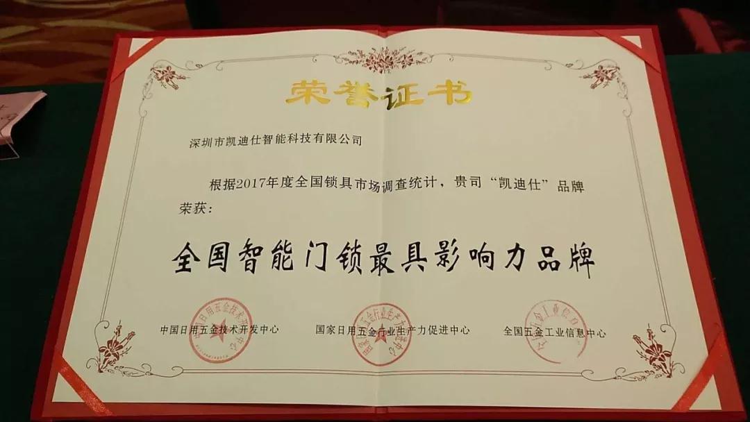 喜訊,凱迪仕獲“全國智能門鎖最具影響力品牌”榮譽,由中國日用五金技術(shù)開發(fā)中心、國家日用五金行業(yè)生產(chǎn)力促進(jìn)中心、全國五金工業(yè)信息中心聯(lián)合頒布。
