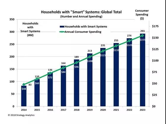 近年來,物聯(lián)網(wǎng)科技高速發(fā)展,智能家居領(lǐng)域發(fā)展進(jìn)入快車道。據(jù)Strategy Analytics發(fā)布的研究報(bào)告《2018年全球智能家居設(shè)備預(yù)測》顯示,到2023年全球智能家居設(shè)備的需求將超過智能手機(jī)的銷量。2017年,全球消費(fèi)者購買了6.63億臺智能家居設(shè)備,這一數(shù)字將在2023年增加到19.4億,而智能手機(jī)屆時(shí)的銷量將為18.6億部。該項(xiàng)研究包括各類智能家居設(shè)備,如智能音箱、安全攝像頭、智能燈泡、智能門鎖,數(shù)字恒溫器,網(wǎng)關(guān)和傳感器設(shè)備。