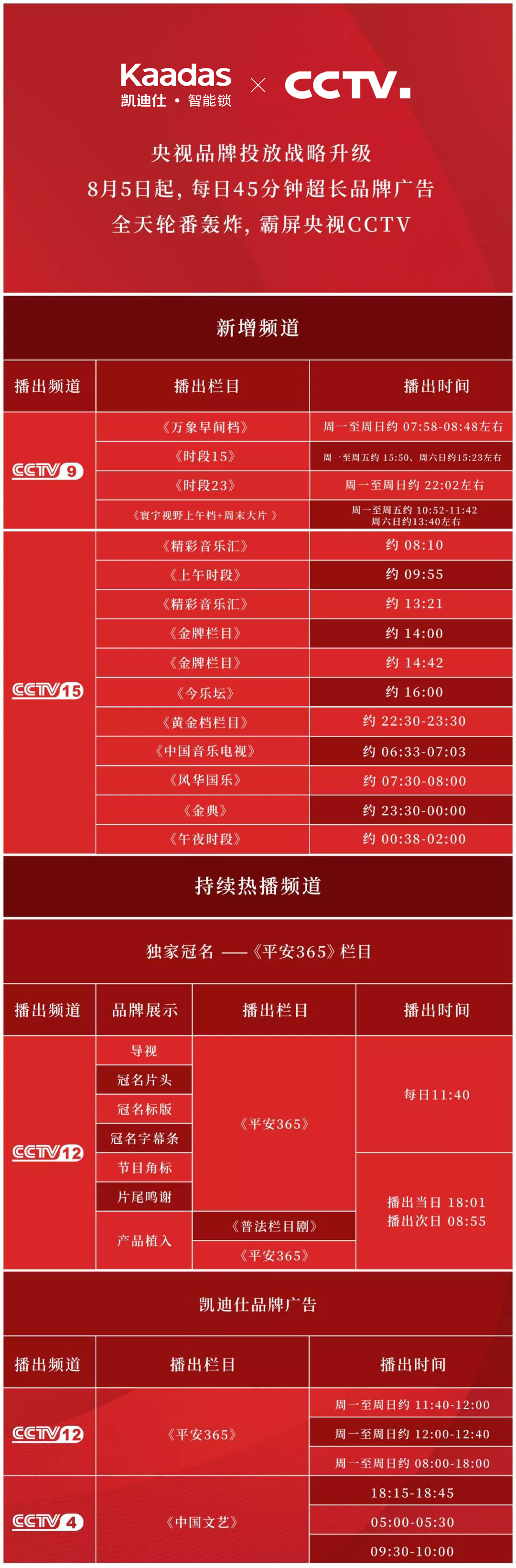 繼去年登陸CCTV-2財(cái)經(jīng)頻道、CCTV-4中文國際頻道和CCTV-6電影頻道后,今年凱迪仕加大合作力度,于6月1日起,持續(xù)霸屏CCTV-4頻道,強(qiáng)勢(shì)登陸CCTV-12社會(huì)與法頻道,并獨(dú)家冠名央視CCTV-12《平安365》節(jié)目,進(jìn)行全天候、多頻道、高密度的輪番展播,不斷擴(kuò)大品牌覆蓋面,形成強(qiáng)有力的品牌聲浪。