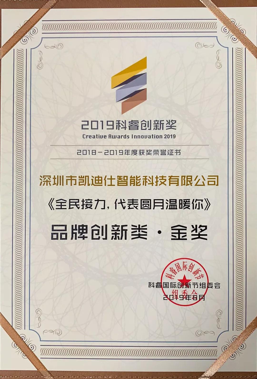 在此次頒獎(jiǎng)典禮上,凱迪仕智能鎖憑借具有社會(huì)影響力的《全民接力,代表圓月溫暖你》H5案例,與支付寶、vivo、京東、伊利、招商銀行等眾多知名品牌共同斬獲科睿創(chuàng)新獎(jiǎng),凱迪仕榮獲品牌創(chuàng)新類金獎(jiǎng),成為行業(yè)內(nèi)首家且唯一獲得此獎(jiǎng)項(xiàng)的智能鎖品牌,品牌影響力再創(chuàng)新高!