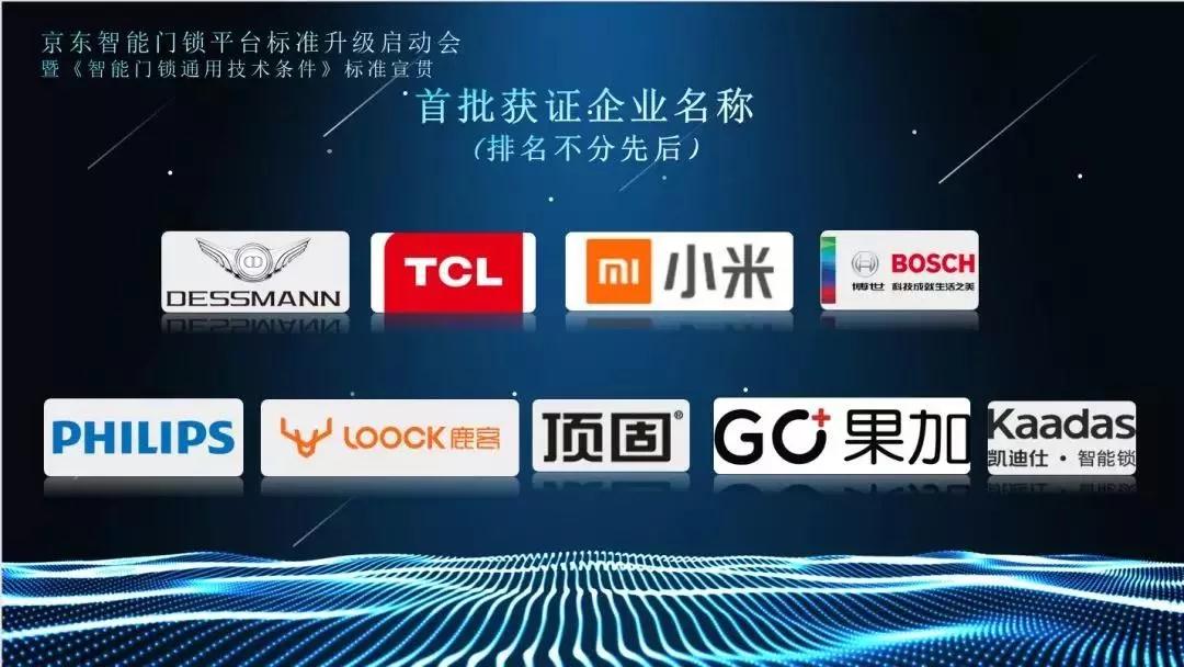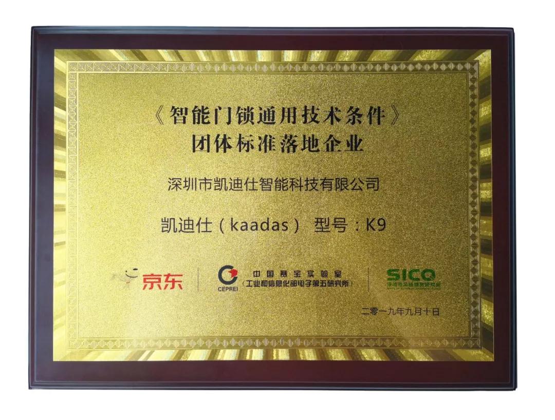 2019年9月10日,由京東零售和深圳品質(zhì)消費(fèi)研究院主辦,中國五金產(chǎn)業(yè)技術(shù)創(chuàng)新戰(zhàn)略聯(lián)盟和工信部電子第五研究所承辦的京東智能門鎖平臺標(biāo)準(zhǔn)升級啟動(dòng)會(huì)在廣州舉行。凱迪仕率先通過該團(tuán)體標(biāo)準(zhǔn)檢測,榮獲“《智能門鎖通用技術(shù)條件》團(tuán)體標(biāo)準(zhǔn)落地企業(yè)”證書,成為首批京東智能門鎖“品質(zhì)優(yōu)選”打標(biāo)品牌。
