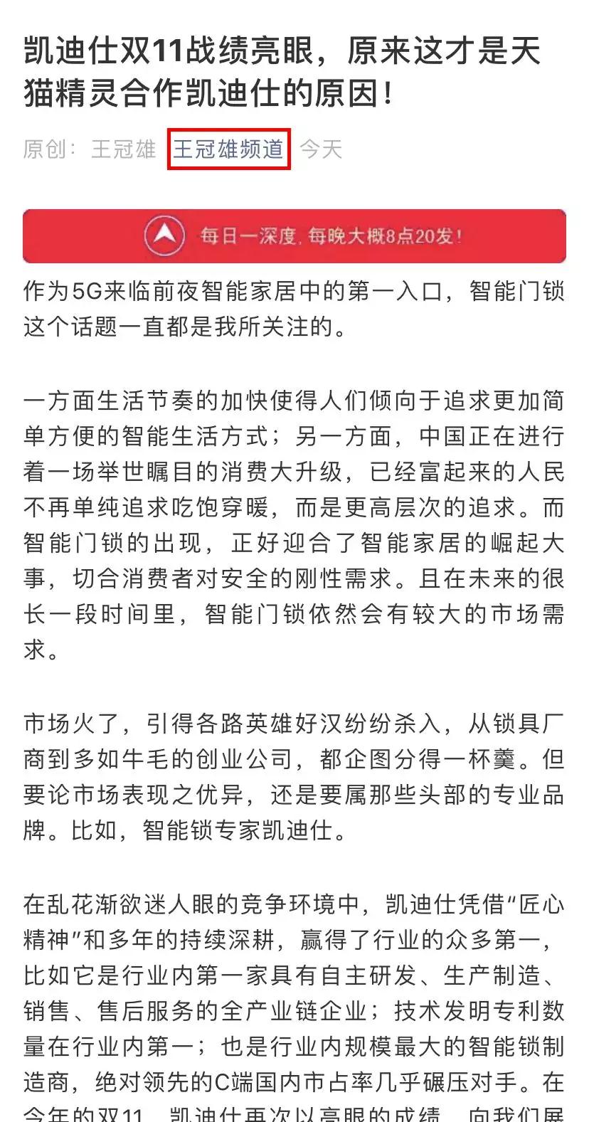 針對(duì)此次凱迪仕與天貓精靈的獨(dú)家戰(zhàn)略合作,新經(jīng)濟(jì)觀察家、意見(jiàn)領(lǐng)袖,首個(gè)豎屏科技脫口秀雄辯·科技show主講人、十大自媒體大咖——王冠雄,在其對(duì)凱迪仕的報(bào)道專訪《凱迪仕雙11戰(zhàn)績(jī)亮眼,原來(lái)這才是天貓精靈獨(dú)家合作凱迪仕的原因!》一文中提到: