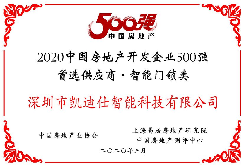 2020年3月18日,以“重塑-遠(yuǎn)見-啟程”為主題的2020中國房地產(chǎn)500強測評成果發(fā)布會暨500強高峰論壇于線上如期舉辦,Kaadas凱迪仕位居智能門鎖類目榜單榜首,榮獲“2020中國房地產(chǎn)開發(fā)企業(yè)500強首選供應(yīng)商”殊榮。自2017年新增智能門鎖測評類目至今,凱迪仕已連續(xù)四年獲得此項榮譽。