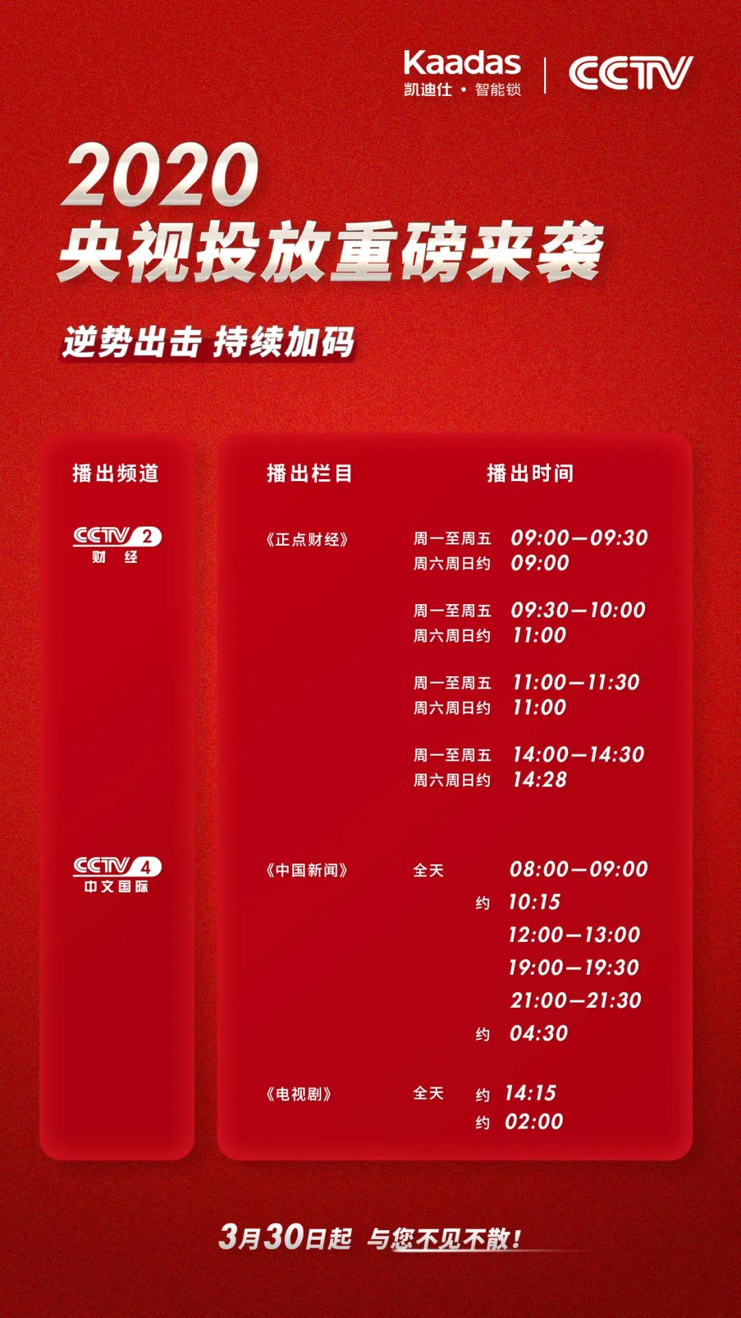2020年3月30日起,凱迪仕還將逆勢追擊,加大品牌戰(zhàn)略投入,強勢登陸央視CCTV-2財經(jīng)頻道和CCTV-4中文國際頻道,迎來2020年凱迪仕央視品牌投放的全新陣容,在多個黃金時段輪番播出,以高頻次、高密度、多時段的全方位露出,向全國眾多家庭展示凱迪仕的品牌力量。