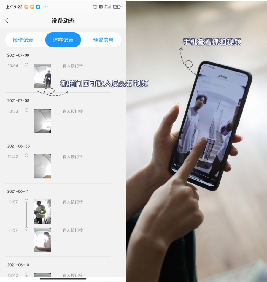? “有心人”門口長時間逗留,自動觸發(fā)徘徊報警,可視貓眼抓拍門口來人視頻,推送報警信息給手機,查看抓拍視頻,及時處理異常情況。