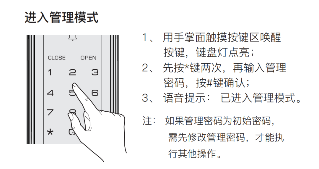 ② 先按**鍵并輸入管理密碼,按#鍵確認(rèn),支持管理指紋的,可按**鍵再按管理指紋,進(jìn)入管理模式;