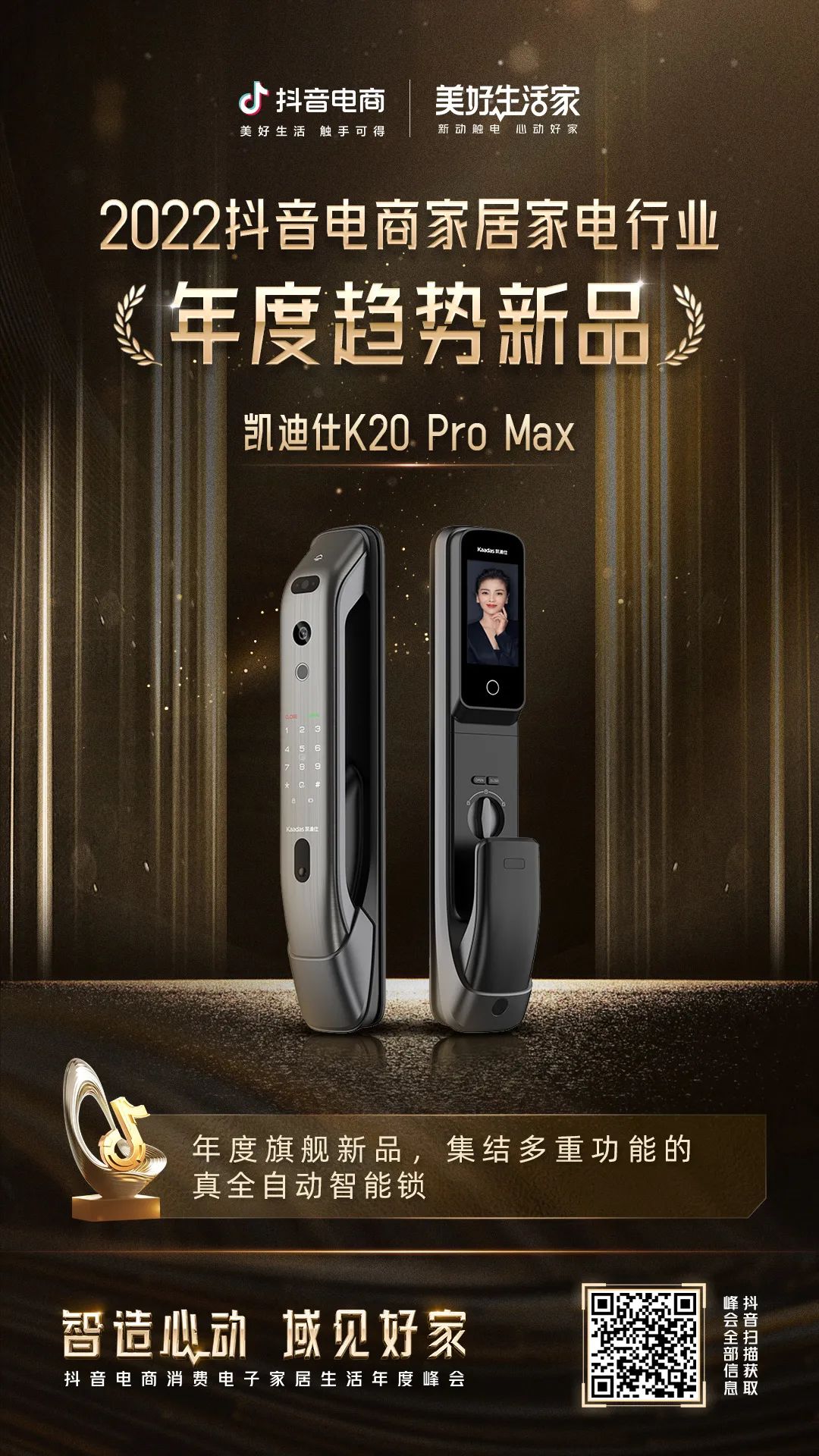 峰會頒獎環(huán)節(jié),各大重磅榮譽一一揭曉,凱迪仕“千里眼”智能鎖K20 Pro Max憑借高顏值、高性能斬獲2022抖音電商家居家電和3C數(shù)碼行業(yè)“年度趨勢新品”重磅榮譽,凱迪仕為智能鎖行業(yè)唯一獲獎品牌。
