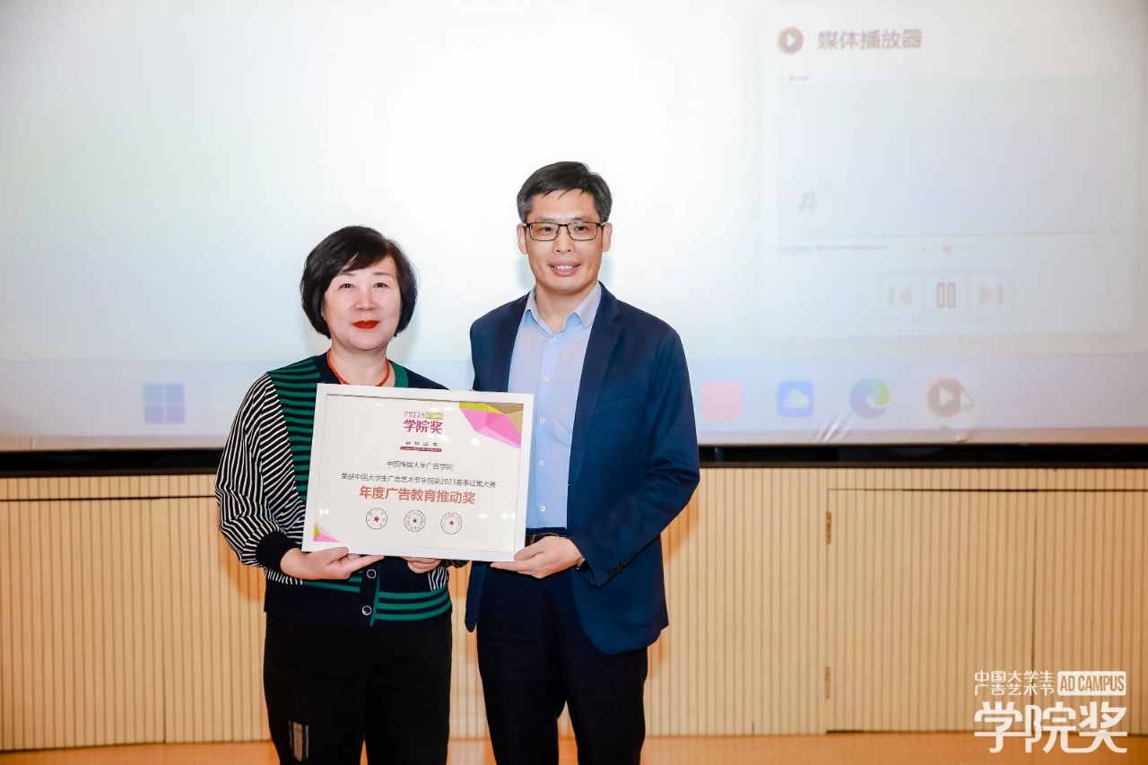 中國傳媒大學(xué)是教育部直屬的首批“雙一流”建設(shè)高校,“211工程”重點(diǎn)建設(shè)大學(xué),“985優(yōu)勢學(xué)科創(chuàng)新平臺(tái)”重點(diǎn)建設(shè)高校,本次巡講活動(dòng)得到了中傳師生的高度支持。中國傳媒大學(xué)廣告學(xué)院院長趙新利教授作為東道主代表致歡迎辭,廣告人文化集團(tuán)黨支部書記穆萍女士為中國傳媒大學(xué)廣告學(xué)院頒發(fā)“年度廣告教育推動(dòng)獎(jiǎng)”證書,趙新利教授作為校方代表上臺(tái)接受榮譽(yù)。